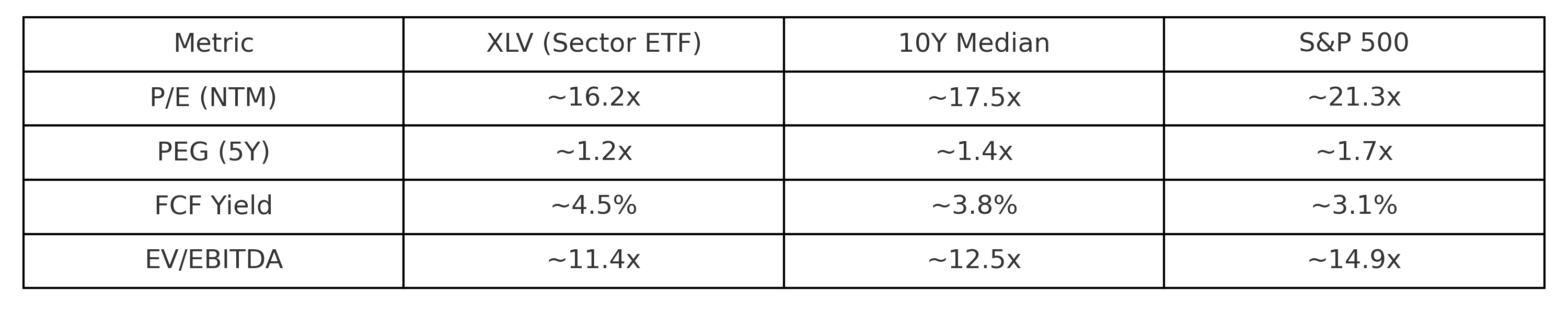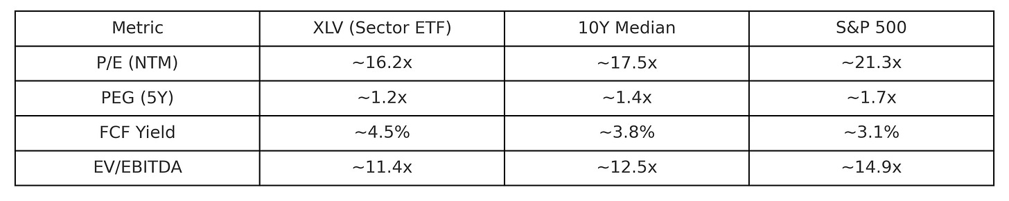 XLV now trades at ~16.2x forward P/E, far below the S&P 500 at over 21x.