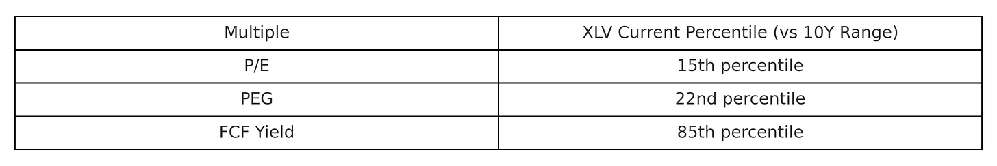 This isn’t just a technical footnote - it’s a moment of sector-wide dislocation. Sentiment has collapsed. Positioning has flipped defensive into discard. But under the surface, fundamentals haven’t broken. Free cash flow yields are rising. PEG ratios are compressing. And multiple subsectors - from managed care to life sciences - are trading at multi-year valuation troughs, despite strong cash generation and capital efficiency.