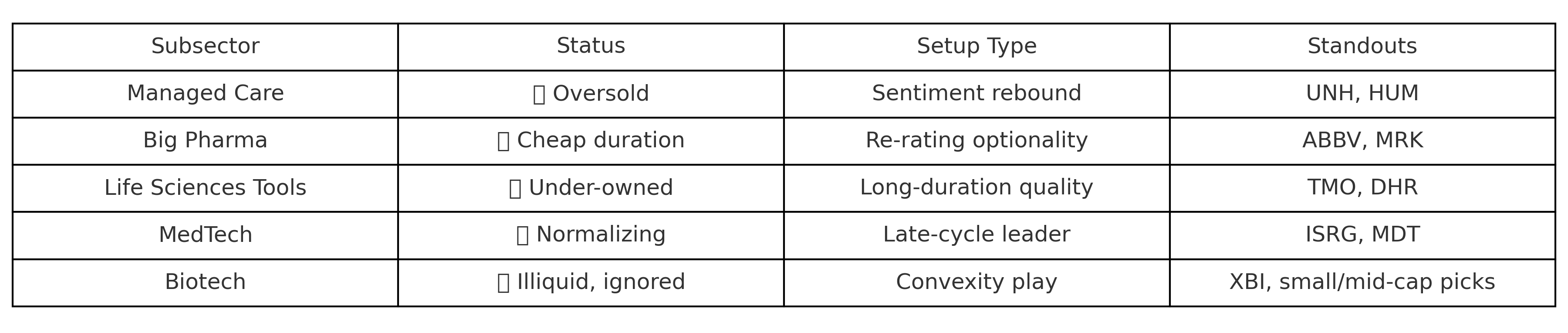Healthcare isn’t a monolith. It’s a cluster of subsectors - each with different exposures to macro, regulation, and innovation. While the sector overall has de-rated, the pain and opportunity are not evenly distributed.