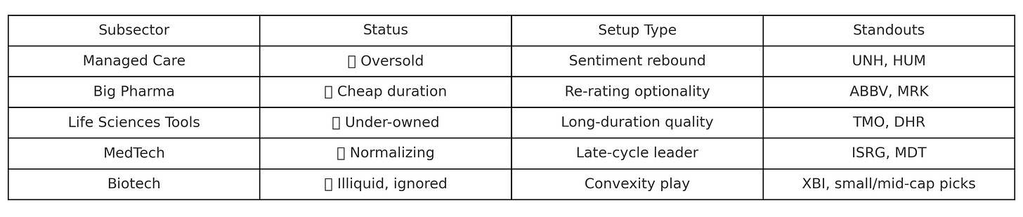 The healthcare sector is one macro regime shift away from a full re-rating. Duration is cheap. Flows are gone. Optionality is building.