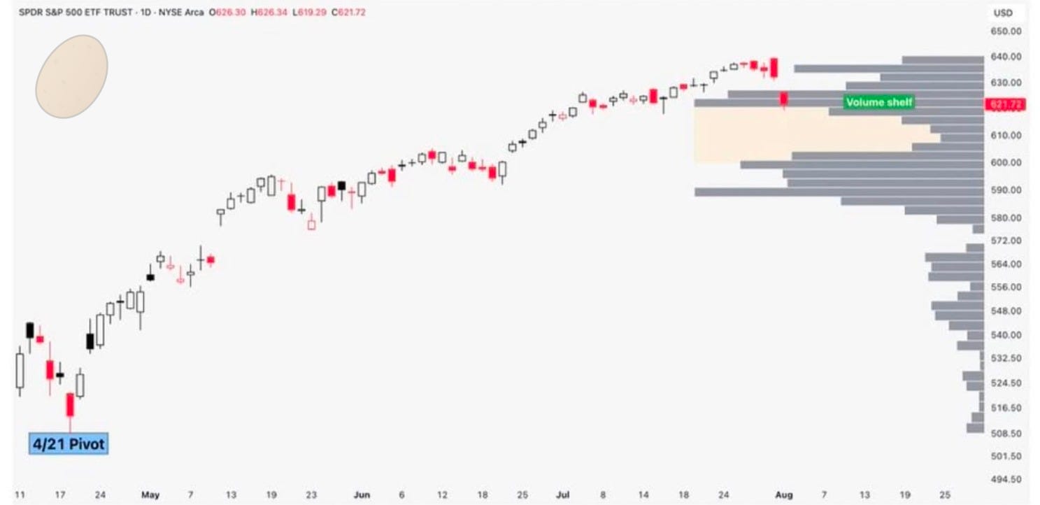 The SPY volume profile also shows an air pocket below 620 - a thin liquidity zone where downside could accelerate: