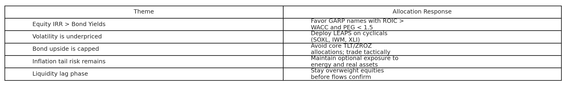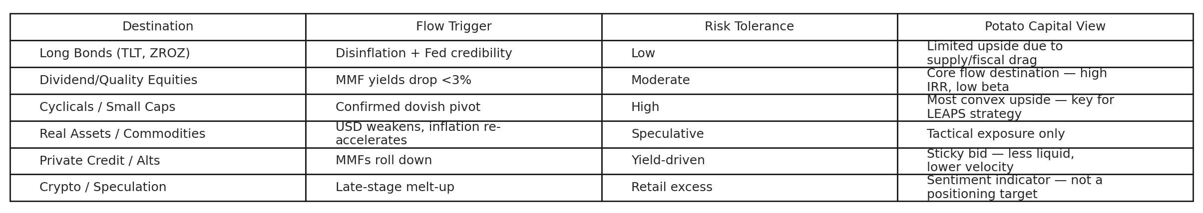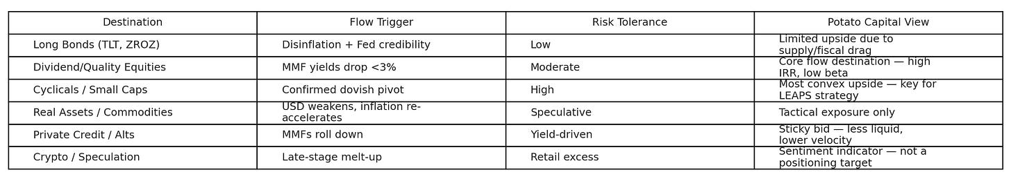 If the Fed pivots to a lower-rate regime - either gradually or abruptly - that wall of cash will start to move. And when it does, it won’t trickle. It will surge into assets with the highest forward return profiles. Bonds may benefit first - but this time, we believe equities may leapfrog them entirely.