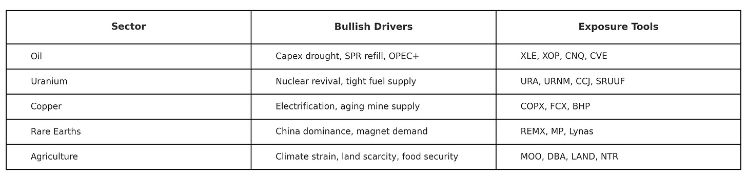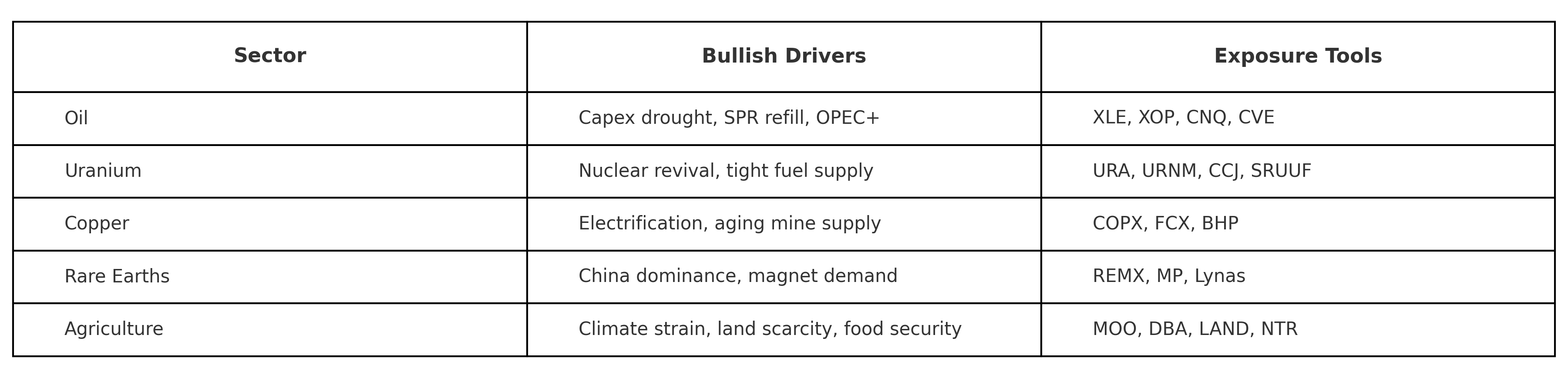 We believe a long-term secular rotation into real assets is underway. After years of capital starvation and ESG underweighting, sectors like oil, uranium, copper, rare earths, and agriculture are reentering the spotlight - with policy, supply chains, and inflation acting as catalysts.