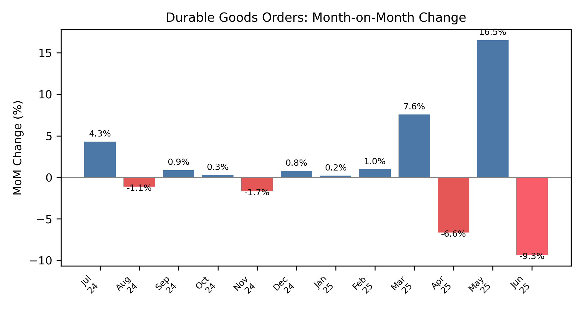 Durable goods orders: Fell –9.3 % month‑over‑month in June, the largest drop since 2020.