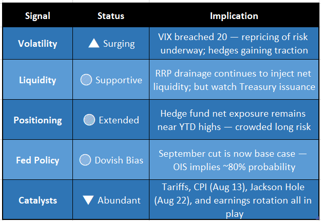 The first week of August brought a decisive break in market momentum. AI leaders rolled over, dragging indices sharply lower. Weak jobs data and rising Treasury issuance pushed real yields higher, triggering a rotation out of rate-sensitive assets. Meanwhile, global macro frictions - including trade tensions and OPEC+ supply signals - drove sharp cross-asset repricing.