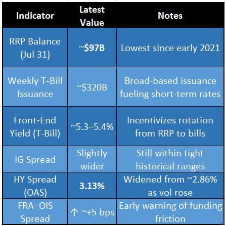 Outstanding RRP balances dropped to ~$97.4B on July 31, 2025 (the lowest in over three and a half years)