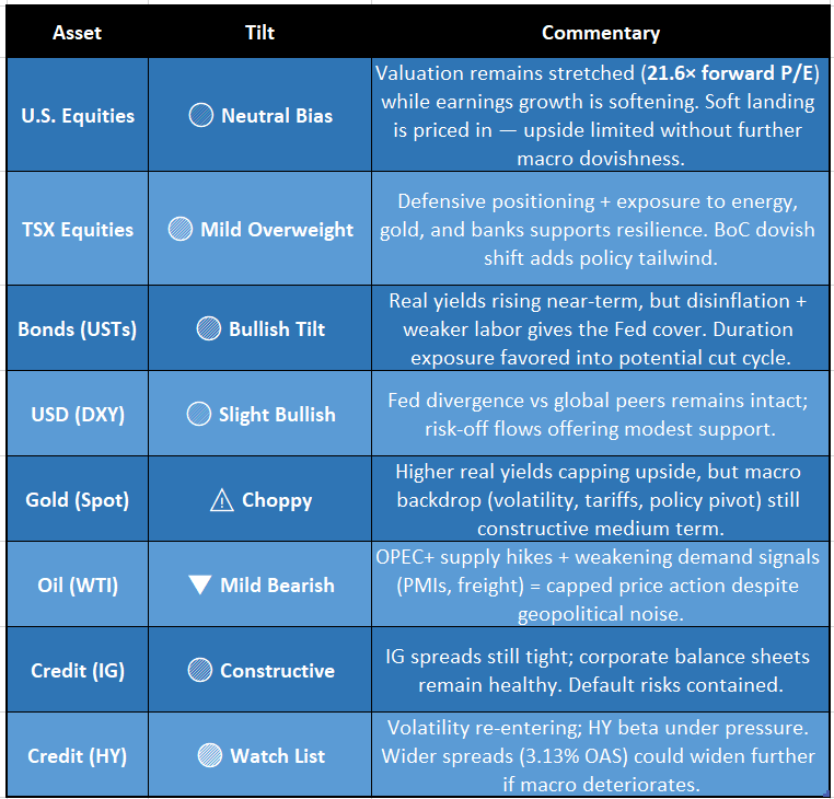 The barbell of quality equity + duration + modest credit risk remains intact - but the passive beta regime is fading. Active tilts, duration overlays, and volatility-aware credit exposure are critical in this new crosscurrent macro.