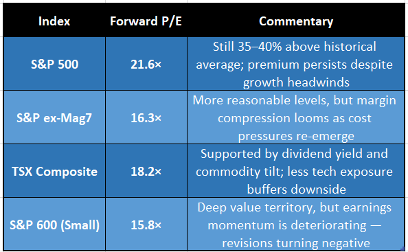 Valuations remain stretched at the index level, especially for mega-caps. With earnings beats narrowing and macro headwinds building, valuation discipline and factor rotation (e.g. into quality and defensives) are key in this regime.