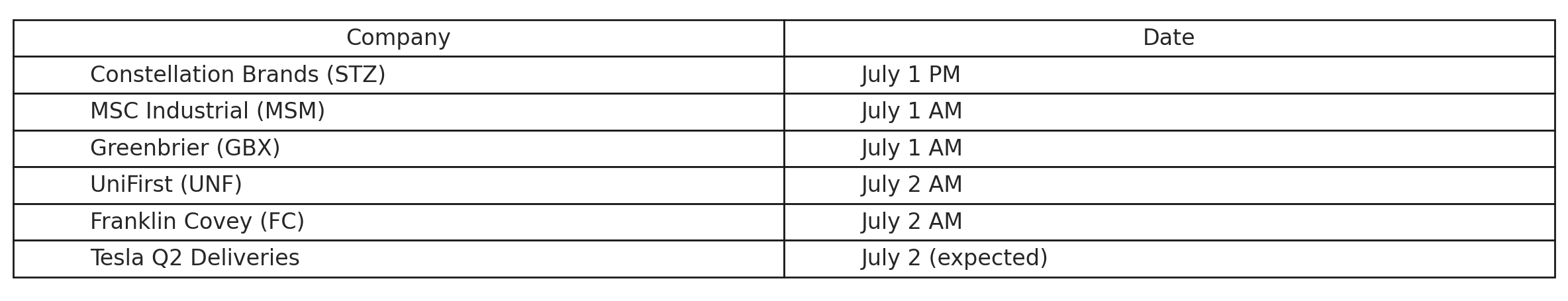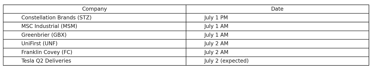 Not a heavy earnings week, but Tesla Q2 deliveries (July 2) and Constellation Brands will draw attention: