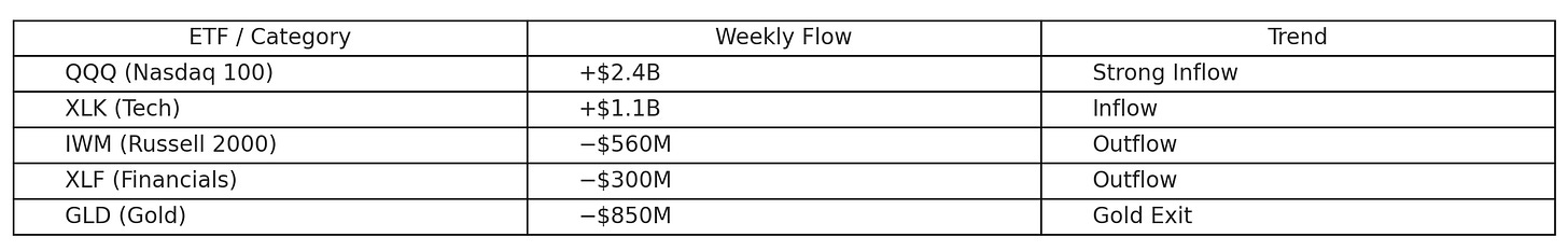 Tech remains dominant, but flows into QQQ and XLK are slowing.