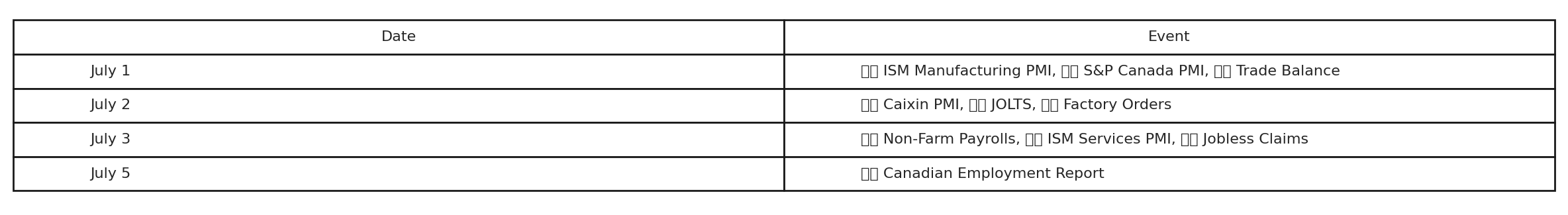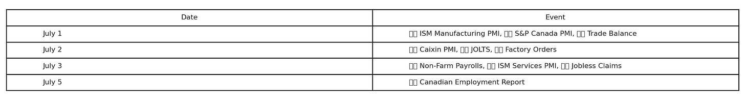 Key risk: Non-Farm Payrolls (July 3) could shift expectations for September cuts. Canada’s jobs report (July 5) may reprice BoC path.
