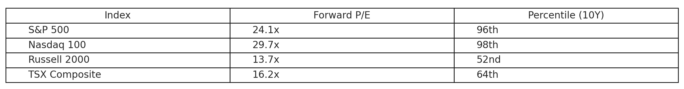 S&P 500 at 96th percentile valuation means we are not underpriced. U.S. equities remain richly valued, especially vs. small caps and international peers.